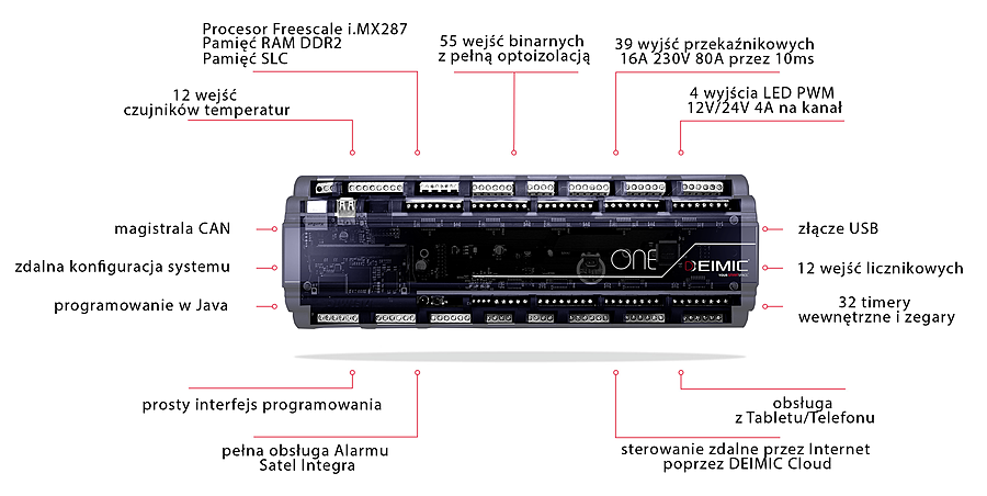System Deimic One może sterować elementami wyposażenia, automatyką budynkową oraz zarządzać instalacjami praktycznie w dowolnej przestrzeni lub obiekcie. Jednostka sterująca Deimic One Master pracuje pod kontrolą systemu operacyjnego Linux wraz z DEIMIC Core. Specyfikacja techniczna modułu centralnego wygląda następująco: