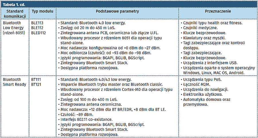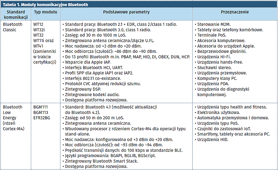 Firma Silicon Laboratory dostarcza szeroki wybór modułów komunikacyjnych w standardzie Bluetooth, Wi-Fi, ZigBee/Thread oraz na pasmo Sub-GHz. W tabeli 1 wymieniono dostępne rozwiązania dla standardu Bluetooth, uwzględniając podział modułów ze względu na wersję standardu oraz zastosowania.