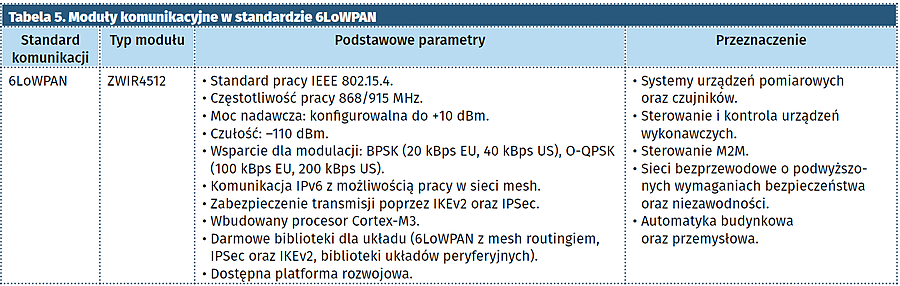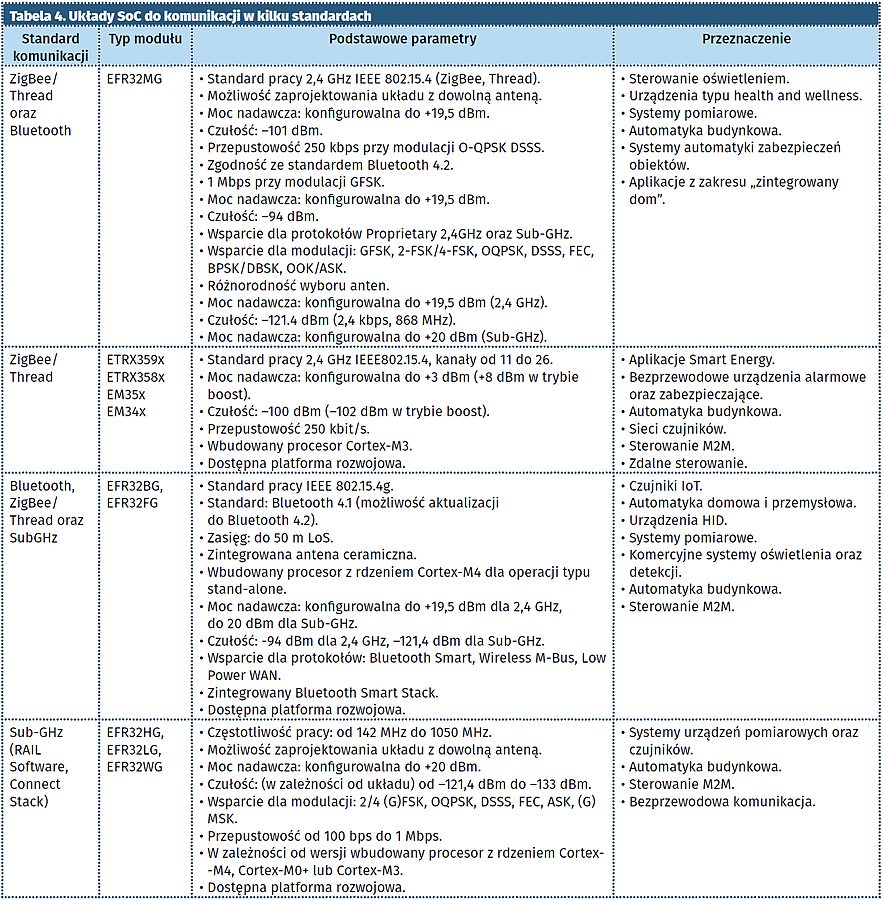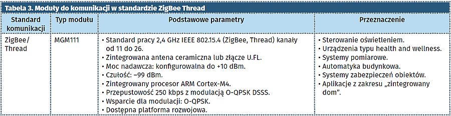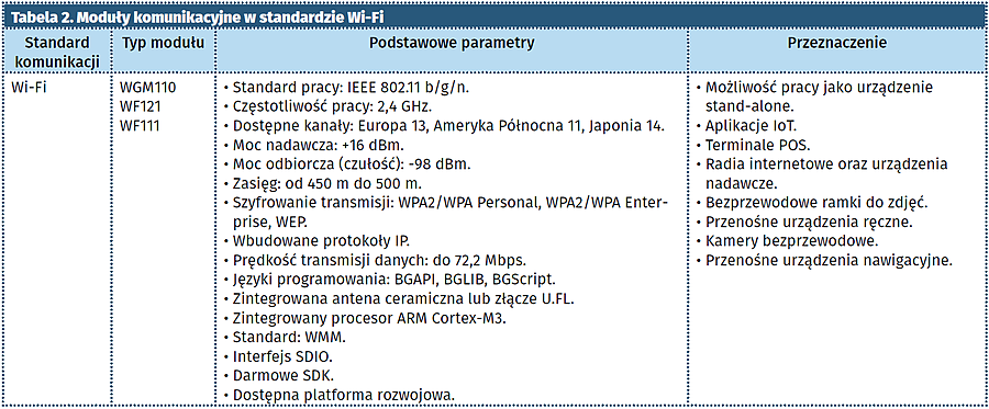 Kolejnym powszechnie stosowanym standardem komunikacyjnym znajdującym się w asortymencie modułów firmy Silicon Labs są moduły Wi-Fi. Tabela 2 zawiera wykaz dostępnych modułów, charakterystyczne parametry oraz zastosowania aplikacyjne.