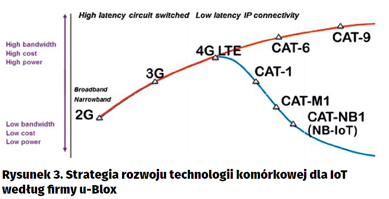 Ten problem dostrzegli producenci podzespołów, którzy koncentrują się na obsłudze rynku przemysłowego, a ich inwestycje w nowe rodziny produktów właśnie się materializują. Równolegle do LTE coraz wyższych kategorii, powstała druga gałąź rozwoju – LTE niższych kategorii przedstawiona na rysunku 3. Są to produkty spełniające kluczowe dla IoT założenia: