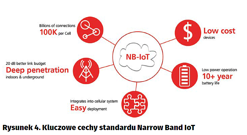 Standard Narrow Band IoT, przez 3GPP nazwany LTE Cat.NB1, nie jest ewolucją 4G/LTE. To zupełnie nowy standard, który zapewnia ekstremalnie niskie zużycie energii (10 lat działania przy zasilaniu z baterii) oraz zapewnia łączność przy sygnale ze stacji bazowej o poziomie o ok. 23 dB niższym niż w wypadku 2G (np. praca w piwnicy o ok. dwa poziomy niżej niż moduł 2G). Dodatkowo, działa w licencjonowanym paśmie, co zapewnia nie tylko globalny zasięg w sieciach LTE, ale również gwarantowaną jakość sygnału. W wielu wypadkach pozwoli to na zastąpienie rozwiązań, które powstawały z powodu braku takiej technologii, a wymagają budowy lokalnych sieci, jak LoRa czy SigFox (rysunek 4).