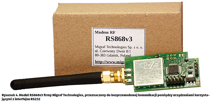 Warto też zwrócić uwagę na moduł RS868v3 firmy Migraf Technologies, który stanowi transparentny modem bezprzewodowy średniego zasięgu. Można go zastosować do zastąpienia przewodowej komunikacji RS232, na odległość do 1 km (na otwartym terenie). Szybkość transmisji sięga 300 kb/s, przy czym silnie zależy od odległości. Dostępna wersja sprzedawana jest z jedną, konkretną anteną, ale dopasować można praktycznie dowolną inną antenę z oferty Microsa, by móc uzyskać mniej lub bardziej kierunkową transmisję. Dodatkowo opcjonalnie możliwe jest włączenie szyfrowania AES.