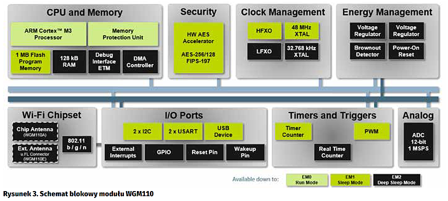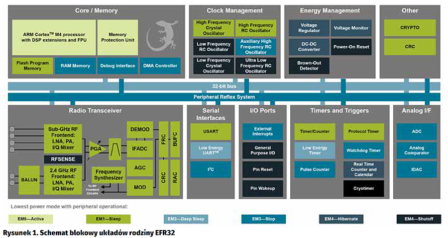 Układy System on Chip z serii EFR32xx (rysunek 1) mające: możliwość pracy z kilkoma protokołami, możliwość pracy w pasmach dwuzakresowych 2,4 GHz oraz 868 MHz, zróżnicowane tryby pracy układów, zwiększające oszczędność energetyczną, konfigurowalną moc nadawczą, zintegrowany procesor ARM Cortex-M4.