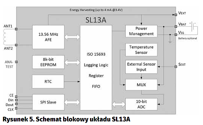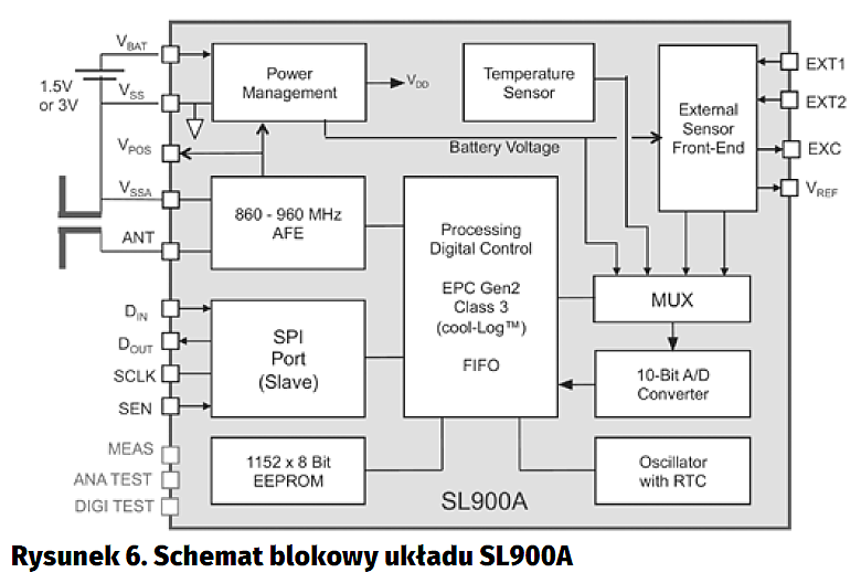 SL900A EPC Tag (rysunek 6): pracujący z protokołem EPC Gen2 w zakresie 860…960 MHz, zasilany polem RF lub bateryjnie, działający w trybie pasywnym lub półpasywnym, ze zintegrowanym czujnikiem temperatury oraz zegarem RTC, dostarczany w obudowie QFN-16.