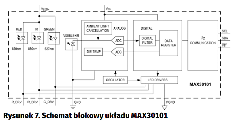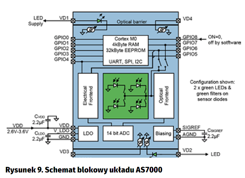 Czujnik biomedyczny ze zintegrowanym MCU AS7000 (rysunek 9, ams): zintegrowany procesor Cortex M0, zintegrowane diody podczerwieni oraz zielona, zintegrowane filtry na sensorach optycznych, nie wymaga zewnętrznych układów zarządzających, zintegrowane drivery LED, dostępne algorytmy HRV, PRV. Dostępny zestaw startowy.
