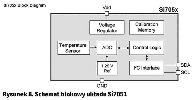 Czujnik temperatury Si7051 (rysunek 8, Silicon Laboratories): dokładność pomiaru 0.1°C w zakresie +36…+41°C, obudowa DFN o wymiarach 3 mm×3 mm, pobór prądu przy próbkowaniu 1 Hz – 195 nA, skalibrowany fabrycznie, 14-bitowy przetwornik A/C.
