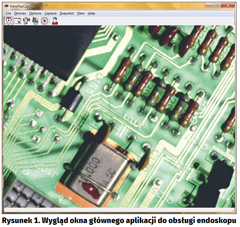 Pracę z endoskopem rozpocząłem od uruchomienia instalatora oprogramowania dla systemu Windows dostarczonego na płycie CD. Widocznym efektem jego pracy było utworzenie na pulpicie skrótu do pliku wykonywalnego. Następnie przyłączyłem endoskop do portu USB i poczekałem na zainstalowanie się sterowników. Okno główne aplikacji do obsługi endoskopu pokazano na rysunku 1. Co ciekawe, interfejs użytkownika umożliwia wybór urządzenia, które jest źródłem obrazu i dźwięku (dźwięk nie jest rejestrowany przy obsłudze opisywanego endoskopu), więc gdy odłączymy endoskop, to program również współpracuje np. z kamerą dołączoną przez USB lub wbudowaną w notebook. Nieskomplikowane menu umożliwia wykonanie fotografii, zarejestrowanie filmu, ustalenie parametrów rejestracji (prędkość zapisu, rozdzielczość, przestrzeń barw, jasność i kontrast) oraz wykonywanych zdjęć (rozdzielczość i format), przerzucenie obrazu i wykonanie odbicia lustrzanego, załączenie filtrów nagrywanych sygnałów wideo oraz audio itd. Oprócz uruchamianej przeze mnie wersji dla systemu Windows, firma udostępnia również wariant dla Linuksa. W Internecie można też znaleźć instruktaż, jak dołączyć endoskop do tabletu z Androidem (wówczas pracuje on jako kamera internetowa USB).