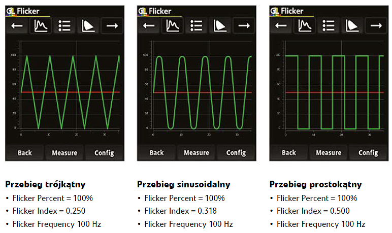 GL SPECTIS 1.0 T Flicker to kolejny przyrząd z rodziny inteligentnych spektrometrów. Łączy pomiar tętnienia światła z jego analizą spektralną. Korzystanie z urządzenia jest niezwykle łatwe i nie wymaga specjalistycznej wiedzy technicznej lub optycznej. Jeden przycisk uruchamia pomiar, a na wyświetlaczu są prezentowane kluczowe dane: natężenie oświetlenia; wskaźnik oddawania barw zgodny z CIE, CRI; TM-30; temperatura barwowa, CCT, współrzędne barwy zgodnie z CIE 1931 i CIE 1964. Po wybraniu funkcji „Flicker” i ponownym naciśnięciu przycisku pomiaru spektrometr natychmiast pokazuje dane tętnienia światła, tj. częstotliwość, flicker percent, flicker index i SVM (Stroboscopic Visibility Measure). Urządzenie ma wygodny ekran dotykowy, intuicyjny system operacyjny Android. Wyniki pomiarów są automatyczne zapisywane na karcie SD lub przesyłane za pomocą USB. Urządzenie ma funkcję ładowania przez USB.