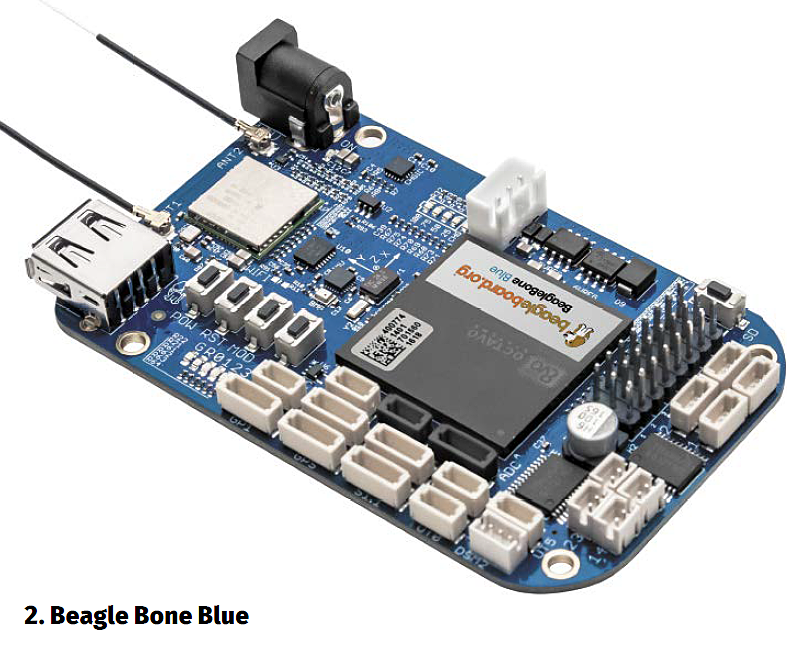 BeaglebBone Blue to specjalizowane rozwiązanie komputera jednopłytkowego przeznaczone do pracy w aplikacjach szeroko rozumianej robotyki. Konstrukcja bazuje na układzie SiP firmy Octavo Systems OSD3358 zawierającym procesor TI AM3358 z zegarem 1 GHz (ARM Cortex-A8), pamięć RAM 512 MB DDR3. Jest też 4 GB wbudowanej 8-bitowej pamięci Flash i jednostka PMU (zarządzania energią). Nie zabrakło też akceleratora grafiki 3D.