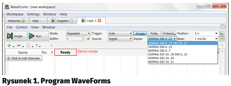 Digital Discovery jest urządzeniem podobnym do Analog Discovery w zakresie współpracy ze środowiskiem WaveForms 2015, którego zrzut ekranowy pokazano na rysunku 1. Jednak ten pierwszy dysponuje tylko narzędziami do pracy z sygnałami cyfrowymi – analizatorem stanów logicznych, generatorem sygnałów logicznych i analizatorem protokołów. Ma możliwość testowania ustalonego stanu wejść/wyjść (tryb statyczny). Pozwala również na tworzenie sekwencji sygnałów cyfrowych przy użyciu edytora skryptów. W swojej strukturze zawiera zasilacz. Digital Discovery ma zatem dodatkowe kanały, większą szybkość próbkowania i dodatkowe możliwości dostosowania do potrzeb użytkownika.