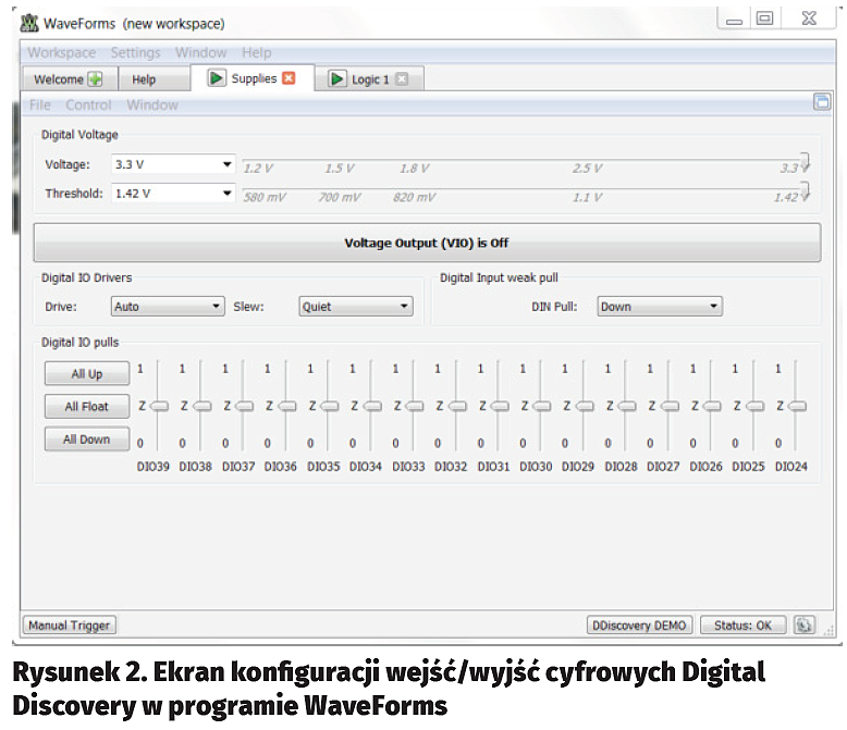 Co więcej, wejścia i wyjścia cyfrowe w Digital Discovery są w pewnym zakresie konfigurowalne. Mianowicie, zasilacz (obok dostarczania zasilania) pozwala na skonfigurowanie specyfikacji wejść i wyjść cyfrowych, dopasowując ją do testowanego systemu (rysunek 2). Istnieje możliwość:
