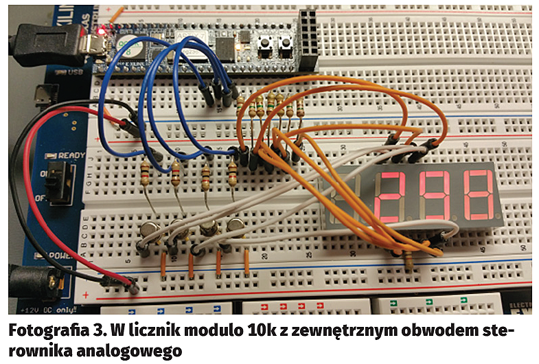 Następnie, kod zmodyfikowano w taki sposób, aby działał z płytką Nexys 4. Cyfra jedności na 4-cyfrowym wyświetlaczu była kontrolowana przez zegar systemowy 100 MHz. Zatem, cyfra tysięcy zmieniała się w zakresie 0…9 z częstotliwością 10 kHz. To zdecydowanie zbyt szybko, aby mogło to dostrzec ludzkie oko.