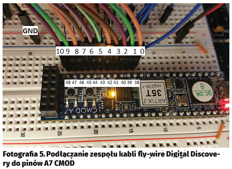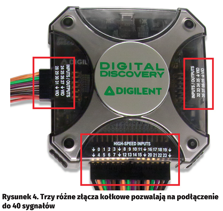 Gdy kod i sterownik działały już poprawnie, następnym krokiem było sięgnięcie po Digital Discovery. Digital Discovery ma 40 pinów I/O, z których 24 są wejściami cyfrowymi wyprowadzonymi na przednie gniazdo 32-pin. Dwa dodatkowe porty, zgodne ze standardem PMOD, umieszczone są na bocznych ściankach urządzenia i mogą być wykorzystywane jako wejścia lub wyjścia (rysunek 4). Monitorowanych było 11 pinów, po jednym na każdy segment i każdą katodę. Wykonane połączenia pokazano na fotografii 5.