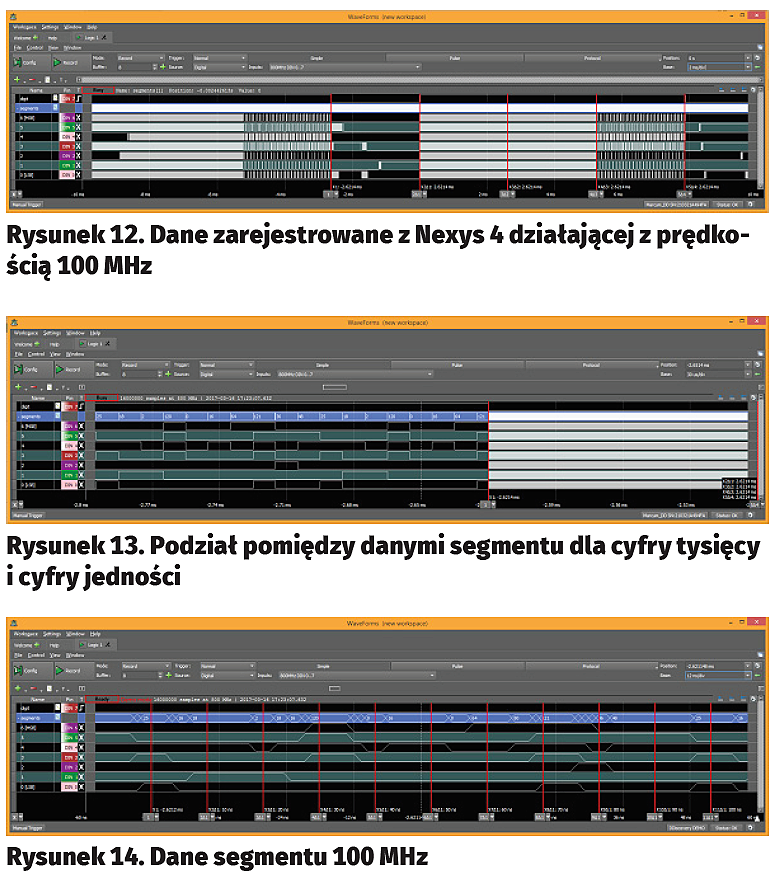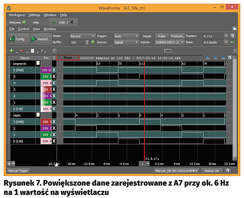 Dzięki wprowadzeniu kilku poprawek w ustawieniach analizatora logicznego Digital Discovery (rysunek 10, rysunek 11) i zarejestrowaniu danych zaczęły one być widoczne. Na rysunku 12 partia danych na lewo od pierwszego czerwonego kursora, to dane sygnału segmentu przy włączonej cyfrze tysięcy. Zbliżając kursor, można było zauważyć obraz pokazany na rysunku 13.