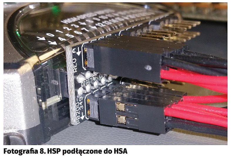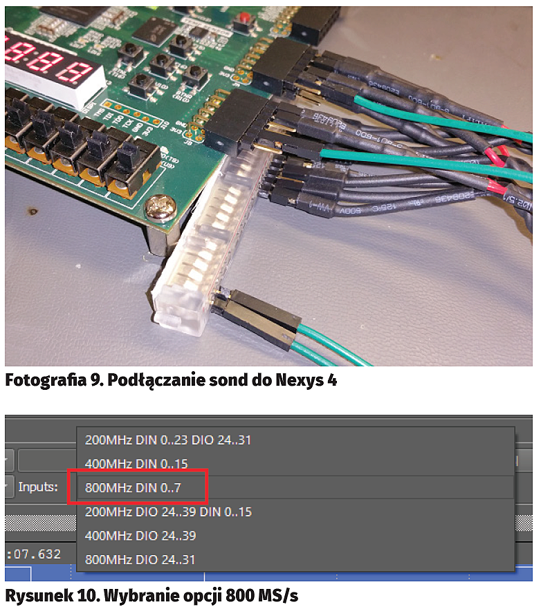 Digital Discovery jest domyślnie ustawiony na pozyskiwanie 200 milionów próbek na sekundę, ale może osiągnąć nawet do 800 MSa/s, co znacznie przekraczało możliwości płytki CMOD A7. Do dalszych testów wykorzystany został zestaw Nexys 4, taktowany zegarem 100 MHz. Jednocześnie, aby skorzystać z opcji 800 MSa/s, konieczne było wykorzystanie adaptera HSA oraz dołączonych do niego sond HPS umożliwiających rejestrację szybkozmiennych sygnałów. Sondy dołączono do Digital Discovery za pośrednictwem adaptera HSA (fotografia 8).
