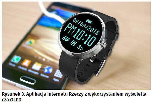Inną zaletą, której nie posiadają wyświetlacze TFT, jest możliwość naniesienia organicznej substancji na podłoże z tworzywa sztucznego. W ten sposób tworzone są elastyczne wyświetlacze, które można dopasować do obudowy urządzenia końcowego. Można je znaleźć m.in. w smartfonach, smartwatchach, czy inteligentne okulary (rysunek 3). Niestety, zastosowanie OLED-ów to nadal dla wielu producentów stosunkowo kosztowne rozwiązanie. Cena modułów OLED jest wciąż wyższa od wyświetlaczy LCD TFT, natomiast energooszczędność jest zależna od jasności i kolorów wyświetlanej treści. Najbardziej optymalne są obrazy z czarnym tłem i jasnymi elementami.