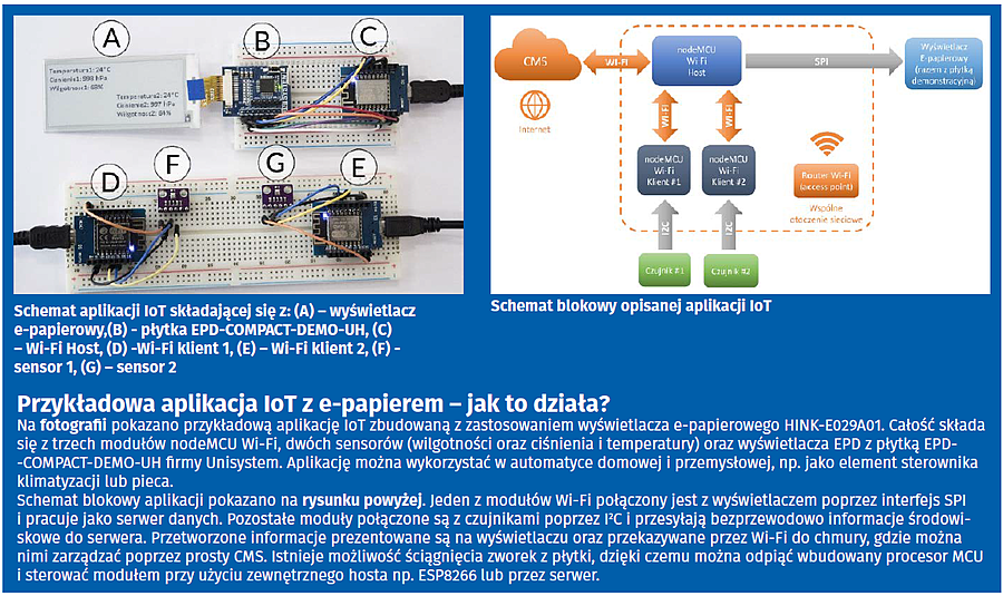 Aplikacje Internetu Rzeczy często są zasilane przy użyciu baterii, więc energooszczędność nierzadko stanowi kluczowy punkt podczas wyboru komponentów. Doskonałym wyborem pod względem niskiego poboru prądu jest technologia e-papierowa (ang. EPD, Electronic Paper Display). Jej działanie oparte jest na bistabilności, co oznacza, że potrzebny prąd pobierany jest jedynie w momencie odświeżania lub zmiany wyświetlanej treści. Natomiast raz włączony obraz jest stale widoczny, a wyświetlacz w tym trybie w ogóle nie zużywa energii.