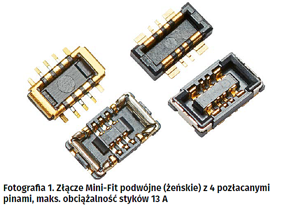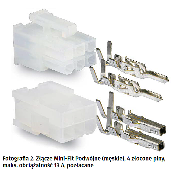 Złącza Mini-Fit (fotografia 1 i fotografia 2) znajdą zastosowanie do przyłączania elementów wykonawczych i sterowniczych oraz odbiorników o większej mocy, np. oświetlenia, ogrzewania.