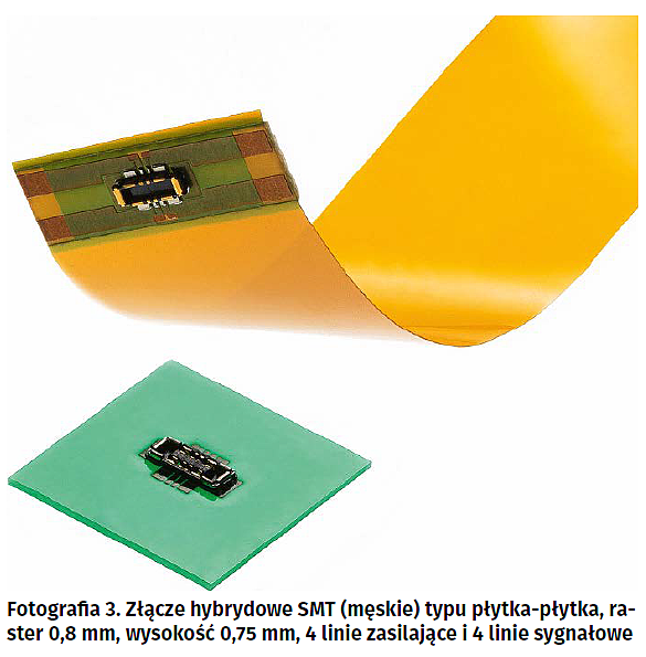Złącza hybrydowe, męskie SMT (fotografia 3, fotografia 4) są przeznaczone do połączeń między płytkami drukowanymi wchodzącymi w skład urządzenia i mają 4 linie sygnałowe do komunikacji oraz doprowadzenia zasilania. Gwarantują trwałość i stabilność połączeń. Nadają się do zastosowania we wszystkich rozwiązaniach IoT w następujących obszarach: przemysł, produkcja, transport, wytwarzanie energii, aplikacje budynkowe, medycyna osobista i sportowa.