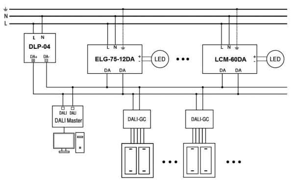 Oprócz możliwości zasilania do 64 oddzielnych wyłączników (DALI-GC) których pobierany prąd nie powinien przekraczać 2 mA, seria DLP-04 może również zasilać kontrolery DALI bez wewnętrznego zasilania (w tym panele DALI, grupy DALI, kontrolery scen, itp.) aczkolwiek w tym przypadku maksymalny pobierany prąd nie może przekroczyć 112 mA (zakładając równoczesne wykorzystanie 64 wyłączników). Należy również zwrócić szczególną uwagę by całkowita długość przewodów magistrali nie przekraczała 300 metrów lub spadek napięcia na końcu linii nie przekraczał 2 V DC, gdyż w innym przypadku mogłoby dojść do nieprawidłowego działania takiego systemu, lub należałoby zastosować dodatkowe elementy aktywne wzmacniające sygnał. Seria DLP-04 jest zgodna z dyrektywami EN55015, EN61547, EN61000-3-2, 3 oraz normą DALI IEC62386-101 – gwarantując tym samym możliwość współpracy z pozostałymi komponentami magistrali innych producentów. Przykładowy schemat magistrali DALI z pracującym w niej zasilaczem DLP-04 pokazano na rysunku 1.