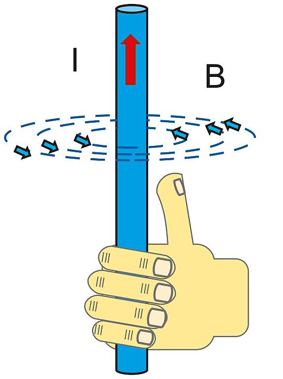 Rysunek 2. Linie sił pola magnetycznego wokół przewodnika, w którym płynie zmienny prąd elektryczny – reguła prawej dłoni