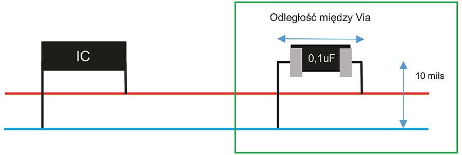 W układzie różnicowym (differential mode) chcemy by pętle prądu były jak najmniejsze, bo zmniejsza to indukcyjność całej drogi prądu. Stąd wniosek, że położenie kondensatora i odległość między Via ma znaczenie dla indukcyjności, w konsekwencji impedancji połączeń. Wiemy już, że zależy nam na minimalizowaniu pętli prądu, co za tym idzie minimalizowaniu indukcyjności połączeń. W tym celu należy zbliżać do siebie Via i umieszczać kondensatory odsprzęgające jak najbliżej układów.