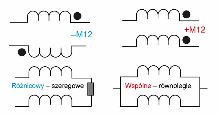 Jeśli przewodniki znajdują się odpowiednio blisko siebie to ich pola magnetyczne oddziałują na siebie wzajemnie, znosząc się i wzmacniając, w zależności od kierunku działania siły. Zależnie od tego ile nachodzą na siebie strumienie magnetyczne, można mówić o sprzężeniu magnetycznym dwóch cewek (mutual inductance – M12) (rysunek 3).