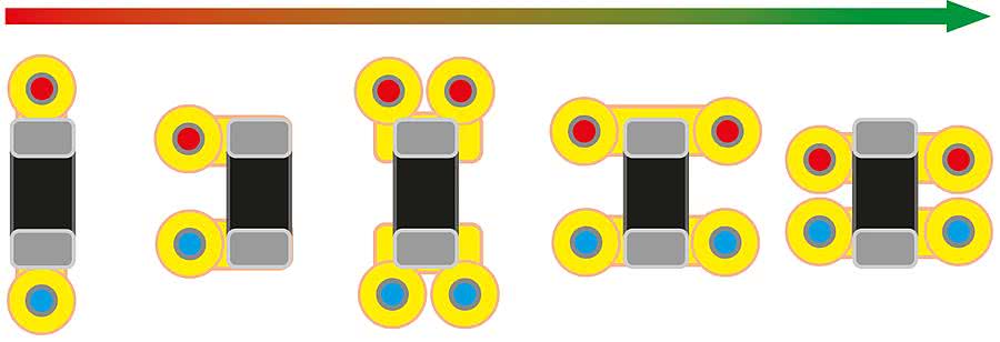 Wspomniałem już że można stosować dublowanie (powielanie) liczby przelotek. Jaki ma to sens, cel? Równoległe połączenie (poszerzenie drogi przepływu prądu) powoduje zmniejszenie impedancji (indukcyjności) połączenia. Zalecane sposoby umieszczania przelotek pokazuje rysunek 10.