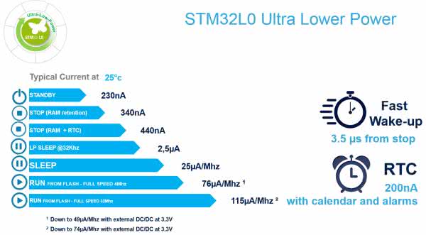 Rodzina mikrokontrolerów STM32L0 jest konstrukcyjnie optymalizowana do pracy w układach zasilanych bateryjnie i wszędzie tam, gdzie jest wymagane niskie zużycie energii. Historycznie powstała później niż STM32F0 i zastosowano tu już zmodyfikowany rdzeń Cortex-M0+, ale taktowany mniejszą maksymalną częstotliwością 32 MHz vs 48 MHz dla rodziny STM32F0.
