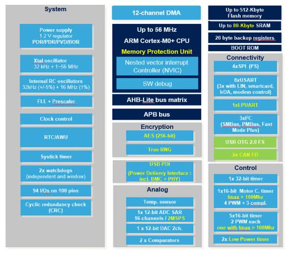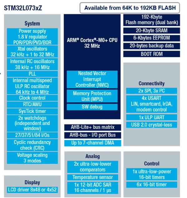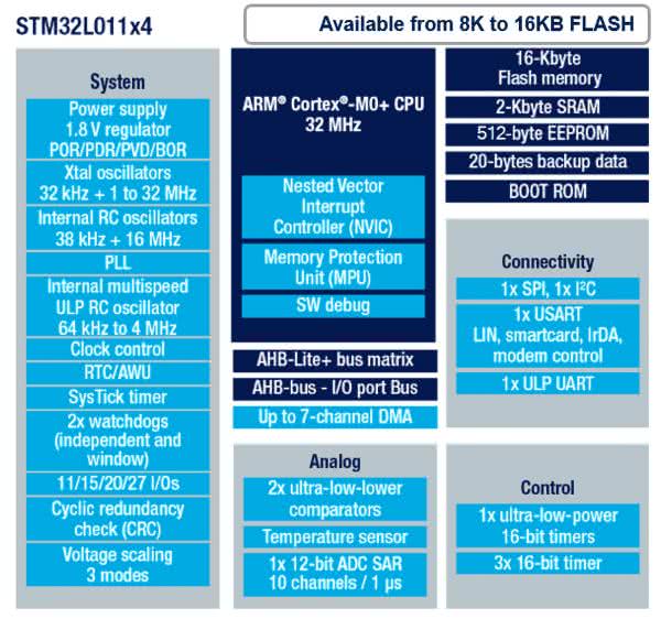 Schemat blokowy mikrokontrolerów rodziny STM32L0 z linii Access został pokazany na rysunku 13. STM32L011x4 ma wbudowane opisywane wyżej układy peryferyjne o ekstremalnie niskim poziomie poboru mocy: 2 komparatory, ULPUART, licznik/timer ULPTIM, oraz RTC. Układów peryferyjnych jest oczywiście więcej, m.in. 12-bitowy przetwornik SAR z 10 kanałami pomiarowymi czasem konwersji na poziomie 1 μs, rozbudowany USART z obsługą interfejsu kart SD, LIN i IrDA , interfejs SPI i I2C, oraz trzy 16-bitowe timery.