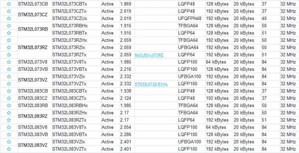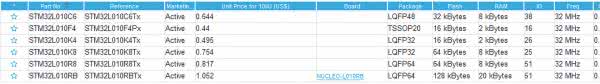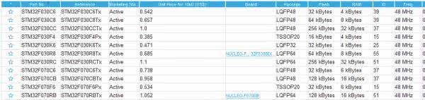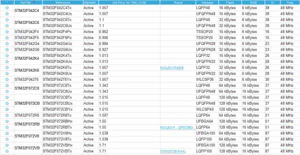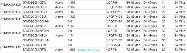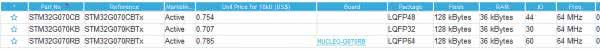 Niestety nie ma w bazie STM32G030 ale są dostępne ceny STM32G070 również Value Line. Jeżeli porównamy te ceny z cenami STM32F0 Value Line z podobną pamięcią Flash (128 kB) to ceny STM32G0 są trochę niższe. Jednak w przypadku F0 możemy znaleźć elementy gorzej wyposażone w pamięć i sporo tańsze. Być może kiedy rodzina STM32G0 powiększy się o prostsze elementy, to będzie również konkurencyjna.