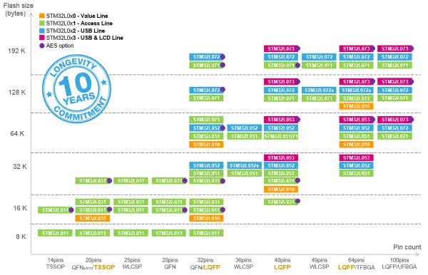 - STM32L0 - optymalizowana pod względem niskiego poboru mocy z rdzeniem Cortex-M0+,