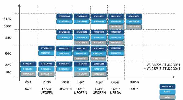 Już na pierwszy rzut oka widać, ze nowa rodzina mikrokontrolerów jest solidnie wyposażona w układy peryferyjne i pamięć, a linia Access Line & Encryption jest mocno zorientowana na stosowanie w aplikacjach IoT. Na rysunku 19 jest pokazane portfolio rodziny STM32G0.
