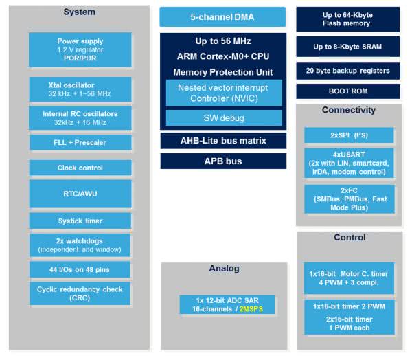 Najnowsza rodzina mikrokontrolerów STM32G0 ma również wbudowany nowszy rdzeń Cortex-M0+ taktowany maksymalną częstotliwością 56 MHz. W założeniu ma być następcą rodziny STM32F0 i została podzielona na trzy linie: