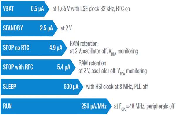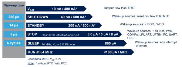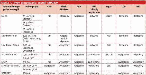 STM32L0 mają możliwość wyboru kilku trybów obniżonego poboru energii. W większości przypadków rdzeń (CPU) jest albo zatrzymany albo wyłączony. Wyjątkiem jest Low Power Run, gdzie rdzeń jest taktowany częstotliwością 32 kHz. Zestawienie trybów oszczędzania energii zostało pokazane w tabeli 1.