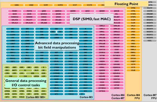 Kolejną modyfikacją wynikającą z uproszczenia struktury rdzenia było zredukowanie listy instrukcji do 56. Żeby zapewnić oczekiwaną kompatybilność programową wszystkie instrukcje Cortex-M0 są podzbiorem instrukcji większych rdzeni i są obsługiwane przez każdy z rdzeni Cortex-M (rysunek 1). W kolejnym kroku usunięto moduł ochrony pamięci MPU i za jednym zamachem uproszczono układ przerwań (mniejsza ilość przerwań obsługiwana przez kontroler NVIC i układ debugowania). Te zmiany zaowocowały drastycznym bo trzykrotnym zmniejszeniem powierzchni krzemu potrzebnej na zaimplementowanie rdzenia z 0,12 mm2 Cortex-M3 do 0,04 mm2 Cortex-M0. Dwukrotnie spadło też dynamiczne zapotrzebowanie mocy z 32 μW/MHz do 16 μW/MHz.
