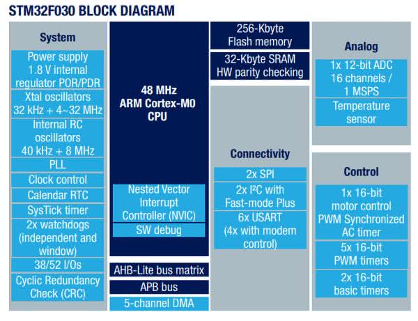 Mimo niezbyt wydajnego rdzenia (jak na 32-bitową jednostkę) STM32F0 broni się dobrym wyposażeniem w układy peryferyjne, oraz dużą pamięcią programu i danych. Na rysunku 3 pokazano schemat blokowy mikrokontrolera STM32F030 z najniższej linii Value.