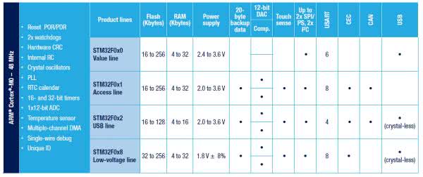 - STM32F0x1 Access Line - z wbudowanym szeregiem układów peryferyjnych, oraz dużą pamięcią programu i danych pozwalającymi na realizację bardziej rozbudowanych aplikacji nie wymagających dużych wydajności rdzenia,