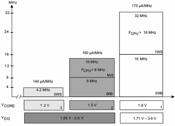 Rozwój urządzeń mobilnych spowodował, że pojawiło się zapotrzebowanie na mikrokontrolery, które mogą efektywnie zarządzać poborem mocy w trakcie kiedy zapotrzebowanie na moc jest ograniczone, a z drugiej strony zużywają relatywnie mało energii w czasie intensywnej pracy. Efektywne zarządzanie poborem energii jest ściśle związane z wbudowanymi trybami czuwania, ale też z dynamicznym inteligentnym sterowaniem napięciem zasilania. Sprawdza się tu ogólna zasada - im niższe napięcie zasilania tym mniejszy pobór energii, ale też mniejsze maksymalne częstotliwości taktowania i tym samym mniejsza wydajność (rysunek 10).