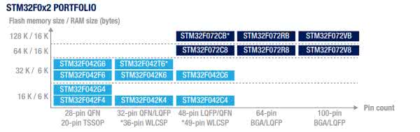 - STM32F0 - historycznie najstarsza z rdzeniem Cortex-M0,