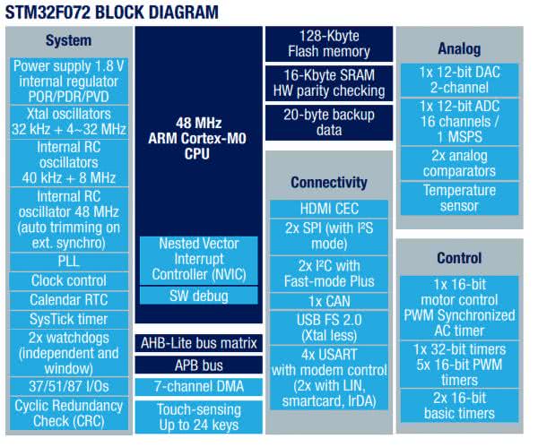Rdzeń Cortex-M0 taktowany częstotliwością 48 MHz jest uzupełniony pamięcią programu wielkości 16 kB i pamięcią danych 4 kB, oraz wieloma układami peryferyjnymi: