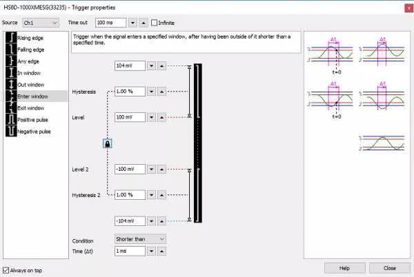Nie bez znaczenia jest także przyjazny sposób obsługi takich przyrządów. Na rysunku 1 pokazano przykładowe okno ustawień wyzwalania - Trigger properties. Przejrzyste pole wyboru z opisem i rysunkami powoduje, że wystarczy jedno spojrzenie, aby zrozumieć znaczenie każdego parametru i ustawić optymalne wartości.