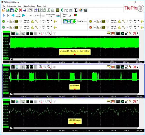 Duży rozmiar pamięci próbek wymaga przemyślanego interfejsu umożliwiającego wygodne przeglądanie zebranych danych. Oprogramowanie umożliwia prezentację sygnałów z praktycznie nieograniczonymi możliwościami powiększania, nawet do miliona razy. Pełny sygnał lub jego fragmenty można wyświetlić na dowolnym ekranie, bez utraty informacji (rysunek 3).