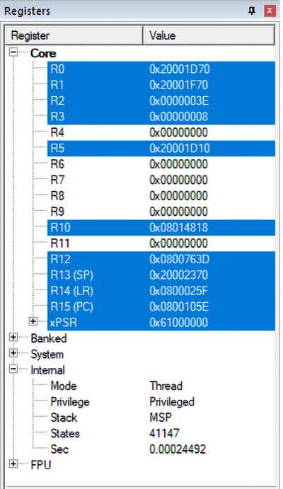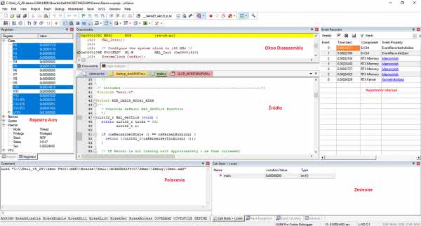 Istnieje kilka okien debugowania, które wyświetlają przydatne informacje podczas realizacji programu, w tym zmienne, rejestry procesora, pamięć systemową i funkcje peryferyjne mikrokontrolera (rysunek 2).