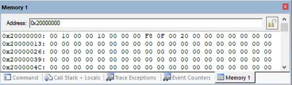Służą do wyświetlania zawartości wybranych adresów w pamięci. Maksymalnie mogą być otwarte cztery okna. Każde z nich, co zostało pokazane na rysunku 3, ma określony początek adresu bloku pamięci, który ma zostać wyświetlony. Wpisuje się go w polu „Adress”, pamiętając o tym, że wartości szesnastkowe zaczynają się od „0x”.
