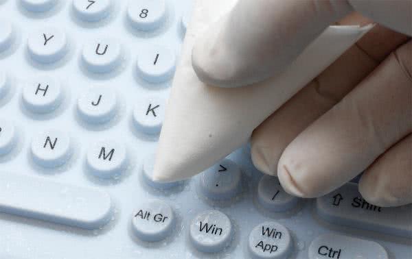 Łatwiejsze w utrzymaniu czystości są klawiatury silikonowe lub mechaniczne pokryte warstwą silikonu. Silikon tworzy powierzchnię hydrofobową, łatwą w myciu a jednocześnie odporną na narażenia chemiczne. Klawiatura taka wymaga jednak zachowania dużej staranności przy usuwaniu zanieczyszczeń z zakamarków pomiędzy klawiszami. Proces ten pokazano na fotografii 2.