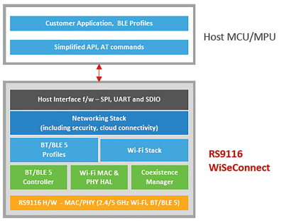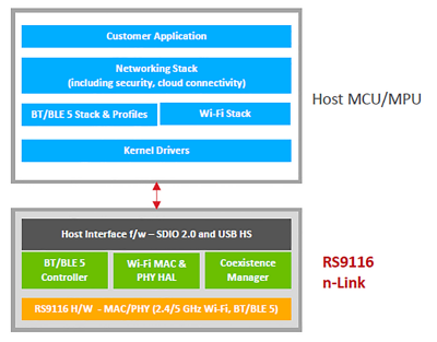 Przejęcie firmy Redpine Signals przez Silicon Labs wzbogaciło rozwiązania producenta o układy Wi-Fi dwuzakresowe, integrujące również komunikację Bluetooth. Rozwiązania Redpine Signals obejmują układy RS9116 wersji n-Link (rysunek 18) oraz WiSeConnect (rysunek 19). Obydwie wersje się miejscem implementacji stosu sieciowego, protokołów oraz specyfikacją dla host MCU/MPU.
