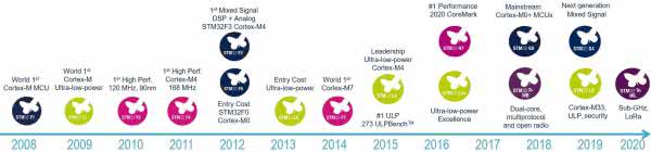 W następnych latach firma ARM wprowadzała kolejne rdzenie i za każdym razem powstawała co najmniej jedna rodzina STM32, rozszerzając wcześniej zdefiniowane trzy kategorie: STM32F0 (z Cortex-M0), STM32L0 i STM32G0 (obie z Cortex-M0+), STM32F4, STM32F3, STM32L4, STM32G4 (wszystkie z Cortex-M4), STM32F7 i STM32H7 (obie z Cortex-M7) oraz STM32L5 (z Cortex-M33).