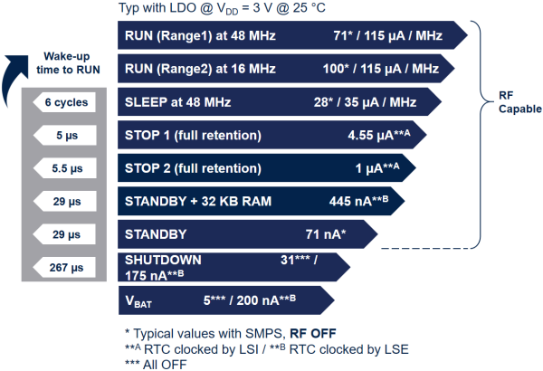 Są to przede wszystkim: LP-UART (wybudzenie poprzez odbiór danych), LP-Timer (wybudzanie cykliczne co zdefiniowany interwał czasu), RTC (wybudzanie cykliczne co zdefiniowany interwał czasu lub jednorazowe wybudzenie – tak zwany alarm), komparator (wybudzenie po tym, jak napięcie na wejściu przekroczy określony poziom), watchdog (wybudzenie po upłynięciu zdefiniowanego czasu), linie EXTI (wybudzenie po zmianie poziomu sygnału na linii I/O).