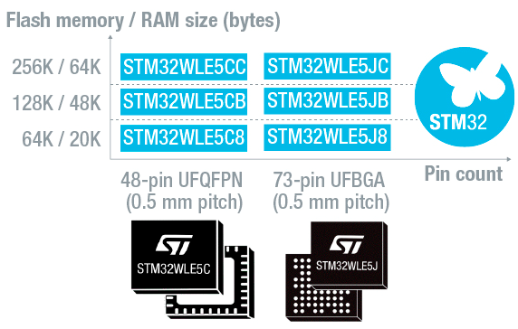 - STM32WL to nie jeden układ, a rodzina układów. Do wyboru są dwa typy obudowy, w ramach których występuje efekt skalowalności pod względem pamięci Flash i SRAM, co pozwala wybrać wariant optymalny pod kątem wymagań danej aplikacji;